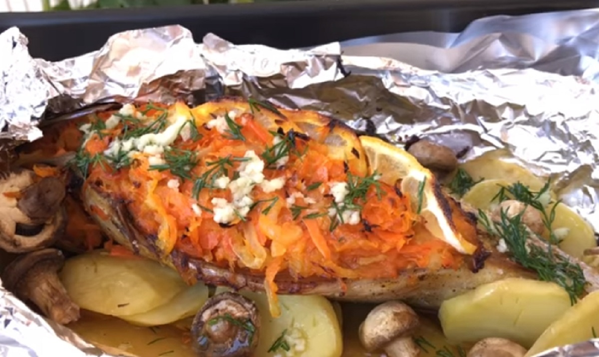 Pokud nemáte již vykuchanou rybu, učiňte tak. Pak maso omyjte a vysušte papírovými utěrkami. Makrelu následně osolte, opepřete a posypejte dle preferencí rybím kořením. Nakonec nechte rybu marinovat několik minut. Mezitím si připravte zeleninu. Cibuli si oloupejte a nakrájejte ji na tenčí půlměsíčky. V další fázi ji orestujte na pánvi s rozpáleným slunečnicovým olejem. Nyní přidejte i oloupanou a nahrubo nastrouhanou mrkev, dosolte a vařte do změknutí zeleniny.