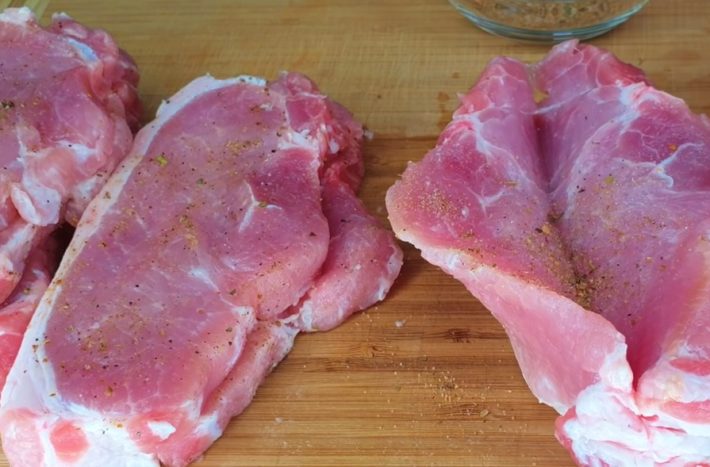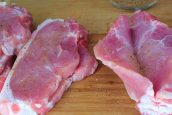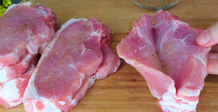 Maso rozdělte na čtyři části a každou část ještě v půli nařízněte, čímž vytvoříte kapsu, kterou budete později plnit. Do misky dejte sůl, mletý pepř, koření na maso a promíchejte. Maso touto směsí okořeňte ze všech stran i zevnitř kapsy, poté ho dejte do větší mísy. Do jiné misky dejte kukuřičný škrob, rajský protlak, nalijte vodu a promíchejte.
