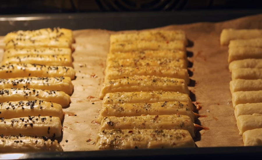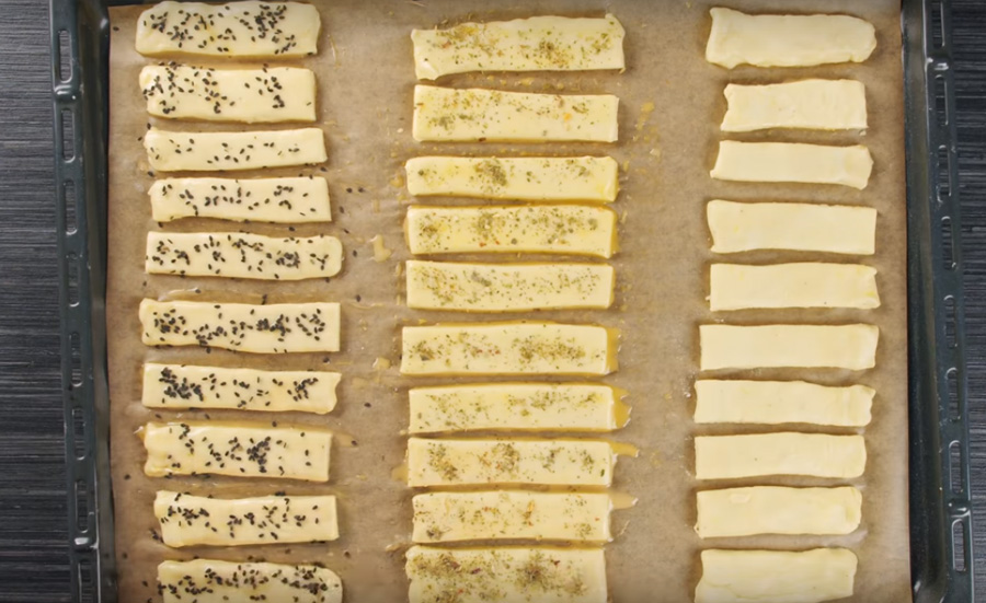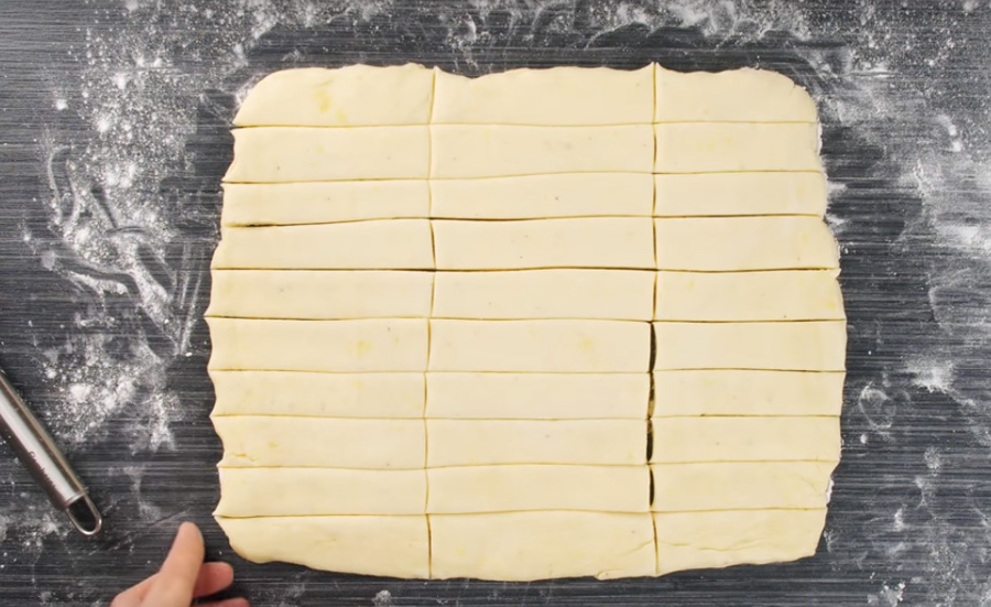 Poté vychladlé těsto vyklopte na lehce pomoučněnou pracovní plochu a válečkem jej vyválejte na tenkou obdélníkovou placku o rozměrech 20 x 30 centimetrů. Tu pak kráječem na pizzu rozkrájejte na podélné proužky silné 2 centimetry příčně překrojte na tři sloupce o délce kolem 10 centimetrů. Takto získáte 30 tyčinek.