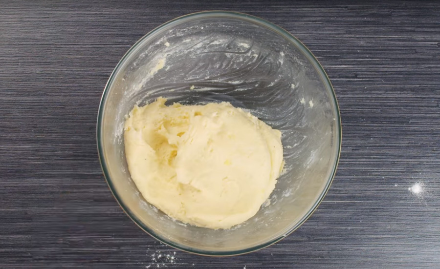To pak přidejte do bramborového pyré, přidejte sůl a mletý černý pepř a důkladně vše zpracujte na jednolitou hmotu. Misku s bramborovým těstem zakryjte pokličkou, alobalem nebo fólií a nechte v lednici 1 hodinu odpočívat.