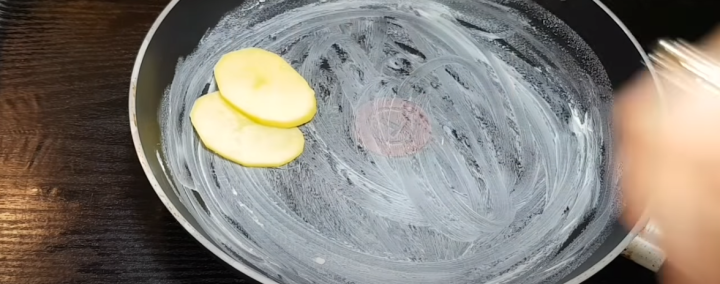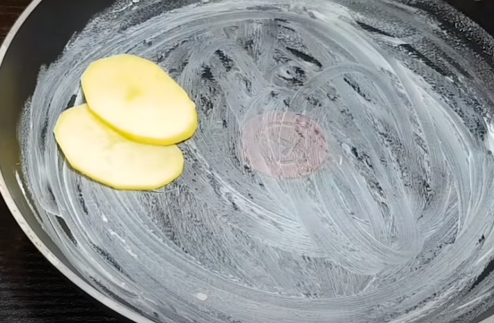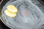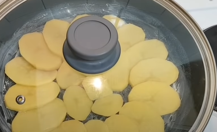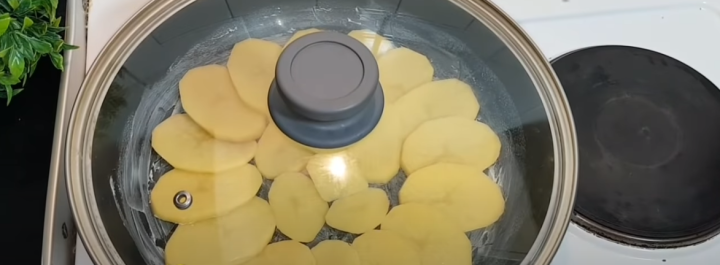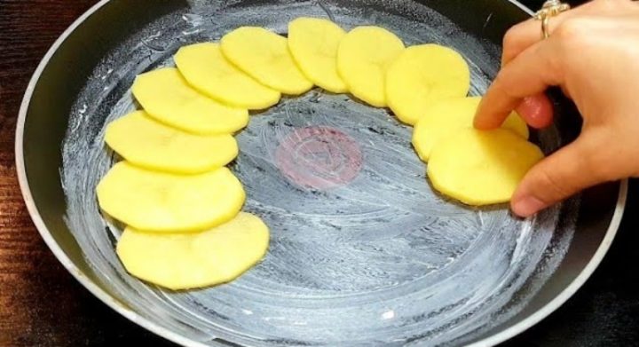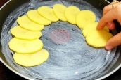 Začněte tím, že si pečlivě oloupete brambory a opláchnete je pod tekoucí vodou. Následně je nakrájejte na tenčí plátky a vyskládejte do máslem vymazané pánve (kolem dokola).