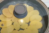 V další fázi brambory přiklopte poklicí a nechte na středním plamenu dusit asi deset minut z obou stran. Abyste snadno zeleninu otočili, položte na ní talíř a pánev překlopte.