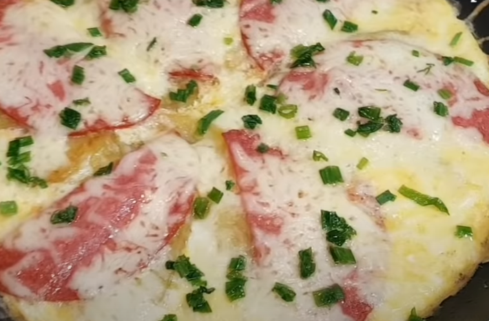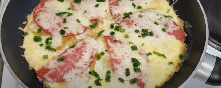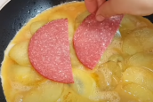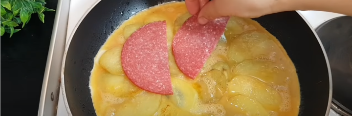 Mezitím si v misce rozšlehejte vejce spolu se solí, mletým pepřem a opečené brambory směsí rovnoměrně přelijte. Na povrch poklaďte plátky vybraného druhu salámu, přidejte případně i oblíbenou zeleninu pokrájenou na kousky (ideální bude paprika), posypte strouhaným tvrdým sýrem, přiklopte pokrm poklicí a nechte péct asi pět minut.