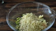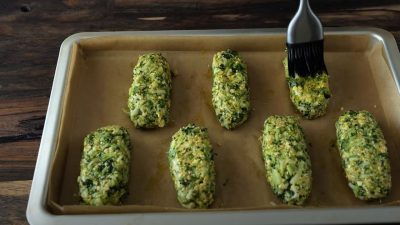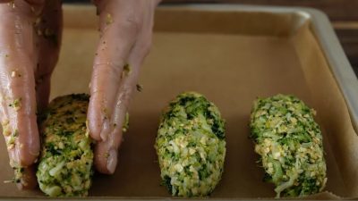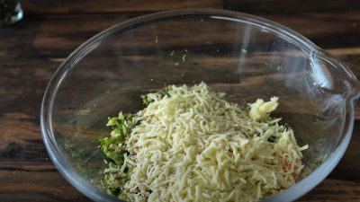 Brokolici přiklopte poklicí a vařte ji v páře přibližně 4–5 minut. Poté ji vyjměte, přendejte ji do mísy a pomocí vidličky ji rozmačkejte. Přidejte k ní ovesné vločky, mozzarellu, sůl, pepř, vejce a prolisovaný česnek.