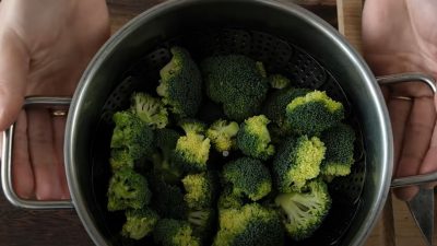 Brokolici dobře omyjte, vyřízněte z ní košťál a rozeberte ji na menší růžičky. Do hrnce nalijte vodu, vložte do něj pařák a vyskládejte na něj brokolici.