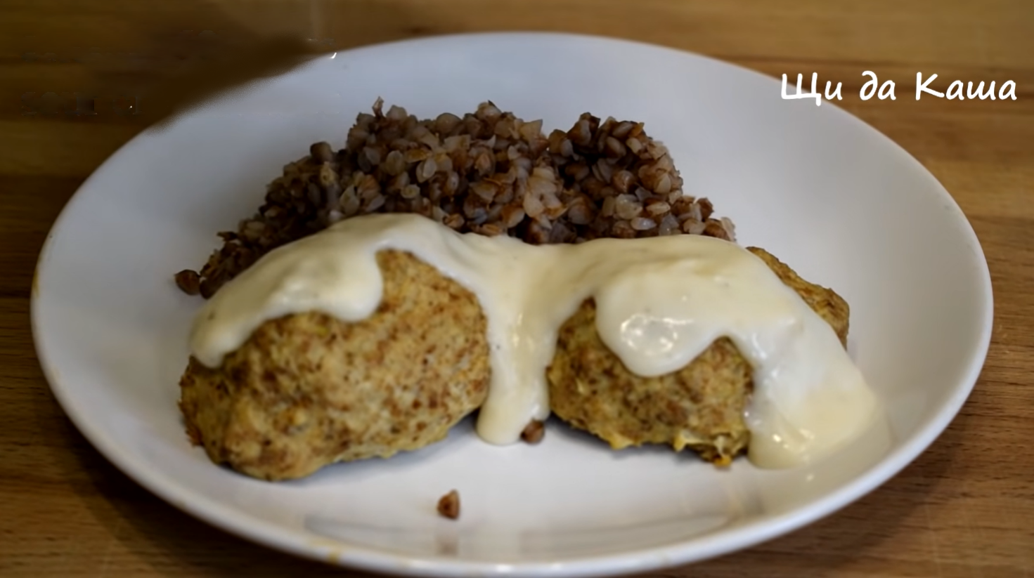 Dopečené karbanátky servírujte na talíř spolu s vařenou pohankou a přelité smetanovou omáčkou.
