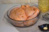 Nejprve si připravte marinádu na maso. Ve středně velké míse si promíchejte koření adžika se slunečnicovým olejem a prolisovanými stroužky česneku. Následně si očistěte kuřecí stehna a vložte je do marinády, dobře promněte, aby chuť koření maso natáhlo.