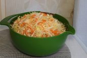 Nechte marinovat asi půl hodiny až 40 minut. Mezitím si očistěte a omyjte veškerou zeleninu a nastrouhejte ji na hrubém struhadle. Zelí, mrkev a cibuli pak ve velké míse dobře promíchejte spolu s trochou soli a slunečnicovým olejem.