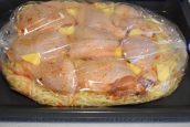 Zeleninu s kuřecími stehny je vhodné péct v pečícím sáčku, který je k dostání běžně v domácích potřebách, pokud jej neseženete, lze samozřejmě pokrm péct v klasickém pekáčku, avšak jeho povrch je nutné z počátku zakrýt alobalem, aby se nespálil. Zeleninu vložte do plechu, nebo pečícího sáčku, položte na ni marinovaná kuřecí stehna, kousky másla, přikryjte alobalem, v případě sáčku dobře zabalte a pečte v troubě 45 minut při 200 stupních Celsia.