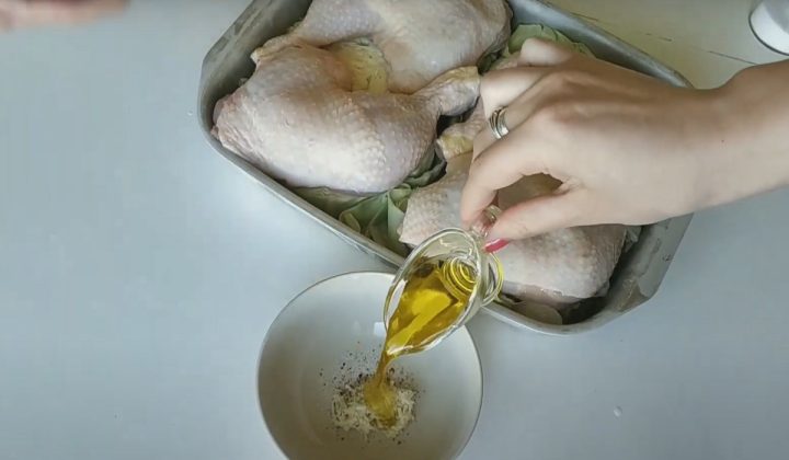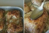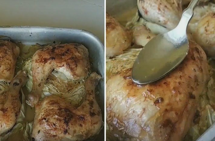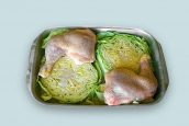 Kuře dejte do trouby a pečte jej přibližně 45 minut na 180 stupňů. Během této doby kontrolujte, zda se kuře nebo zelí nepřipaluje. Pokud uvidíte, že v pekáči chybí voda, dolejte trochu. Vypečenou šťávou zároveň můžete přelívat kuřecí stehna, aby se krásně dozlatova upekla.