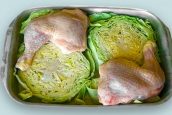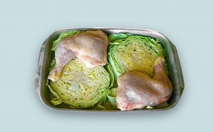Nakrájejte zelí na několik centimetrů silné plátky a rozložte je na plech. Na zeleninový polštář dejte kuřecí stehna a řádně je osolte a opepřete. Pokud chcete nechat vyniknout chuť masa a zelí, nemusíte přidávat už žádné jiné koření. Jestliže ale preferujete výraznější chutě, nebojte se přidat i další druhy koření. Můžete zkusit třeba papriku, kmín nebo různé bylinky dle vašich preferencí.