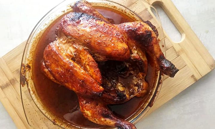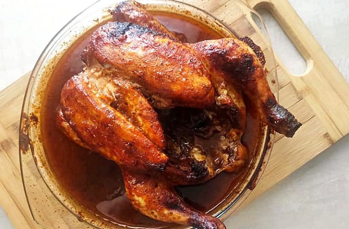 Před pečením otočte kuře prsíčky dolů, přiklopte víkem nebo alobalem a vložte do trouby rozehřáté na teplotu 180 °C, v níž ho nechte péct asi 40 až 60 minut, podle výkonu vaší trouby. Poté pekáč s kuřetem odkryjte a vraťte ho do trouby dopéct na dalších 20 až 30 minut, aby na povrchu krásně očervenalo a vytvořila se křupavá kůrčička.