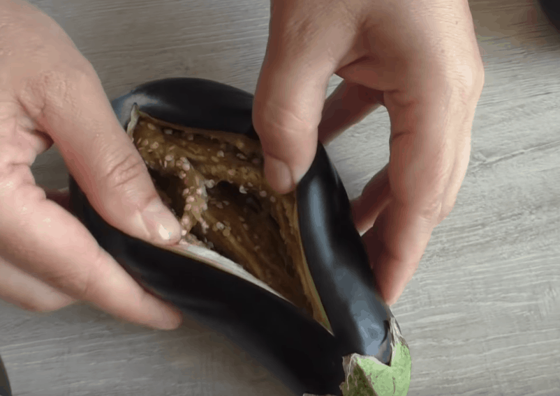 Potlučené lilky vložte do mísy s vodou, do níž přidejte 1 velkou polévkovou lžíci soli. Promíchejte a nechte zeleninu chvíli máčet.