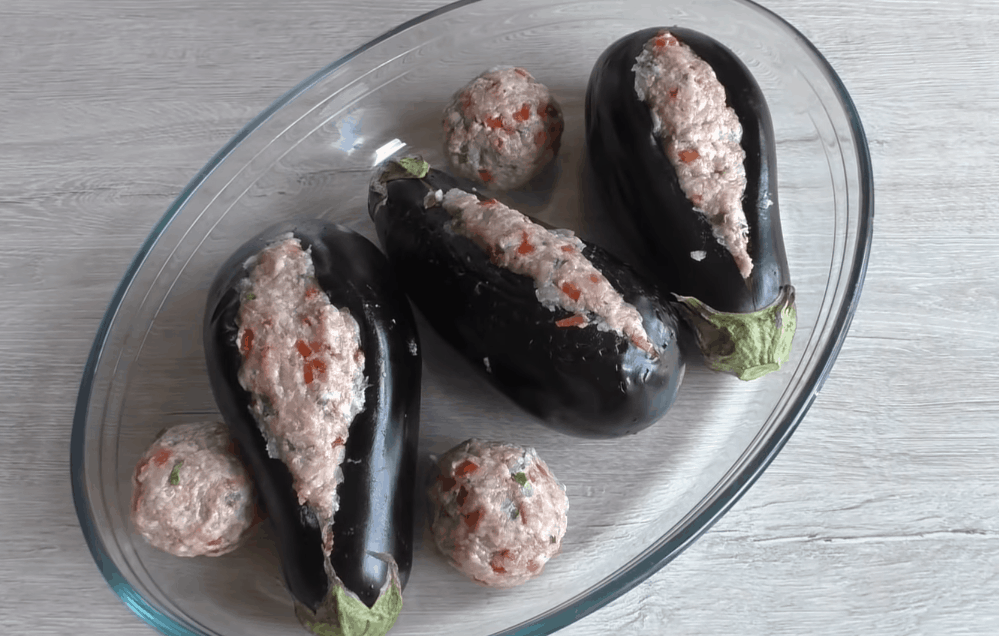 Lilky slijte, nechte okapat, rozevřete nakrojenou kapsu a zeleninu naplňte masovou směsí. Pokud vám masa zbude více, než se vejde do lilků, vytvořte z něj masové kuličky, které vyrovnejte do zapékací misky spolu s plněnými lilky.