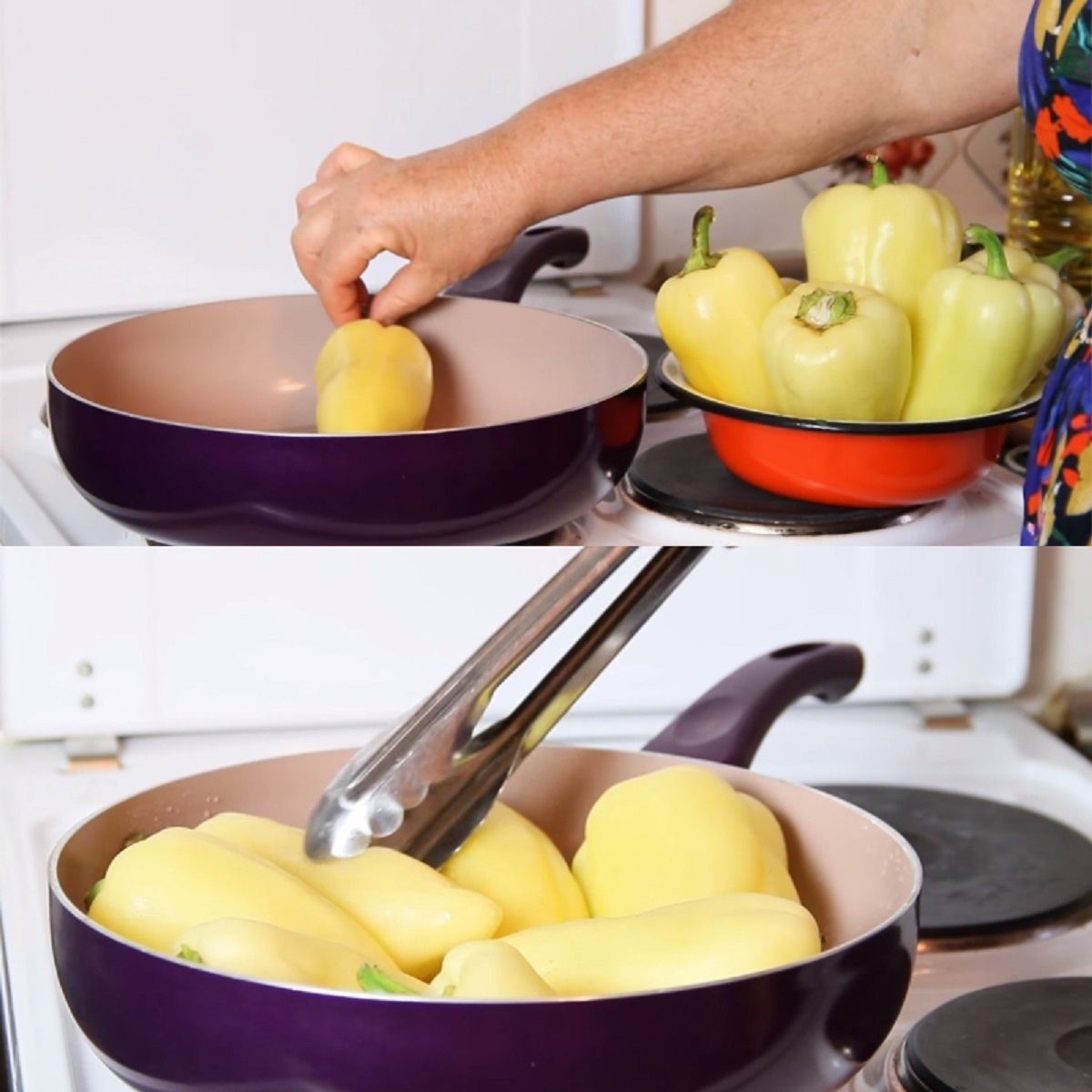 Začněte tím, že si papriky omyjete, osušíte papírovými utěrkami a pokladete v celku na velkou pánev, v které jste rozpálili trochu slunečnicového oleje.