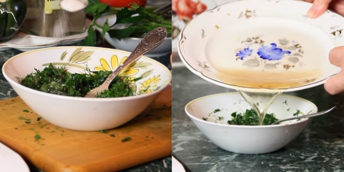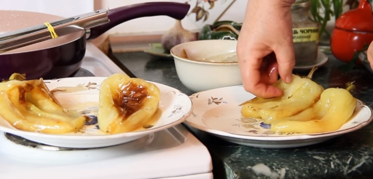 Po dvaceti minutách papriky opatrně vyjměte z pánve, očistěte od semínek a odstraňte slupku. Dužinu rozprostřete na talíř a pusťte se do vaření omáčky. Ve šťávě, kterou pustila paprika, rozmíchejte lisované stroužky česneku, vlijte také ocet, vsypte cukr, jemně nasekaný kopr, sůl dle chuti a vše důkladně promíchejte.