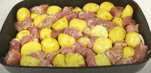 Připravte si velký pekáč nebo zapékací misku a vsypte do něho brambory i maso s cibulí. Všechno promíchejte a rozprostřete po celé ploše dna zapékací mísy tak, aby bylo maso a brambory důkladně proložené a naložené. Pekáč zakryjte hliníkovou fólií a vložte do trouby, kterou jste nechali předehřát na 200 °C. Brambory s masem pečte asi 45 minut. Poté sundejte alobal a pekáč vraťte zpátky do trouby na dalších 15 až 20 minut.