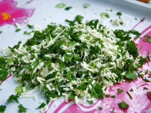 V první řadě byste si samozřejmě měli připravit všechny produkty, které budete k výrobě potřebovat. Poté nastrouhejte sýr najemno, nasekejte petržel a lisujte česnek (nebo nakrájejte najemno). Všechny tři suroviny smíchejte dohromady, aby se důkladně spojily.