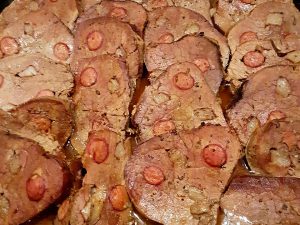 Hovězí váleček protáhněte špekem a debrecínským párkem (v tomto případě druh masa ani párků nezaměňujte, autorka receptu po mnoha pokusech a obměnách konstatovala, že právě tato kombinace je ta jediná pravá).
