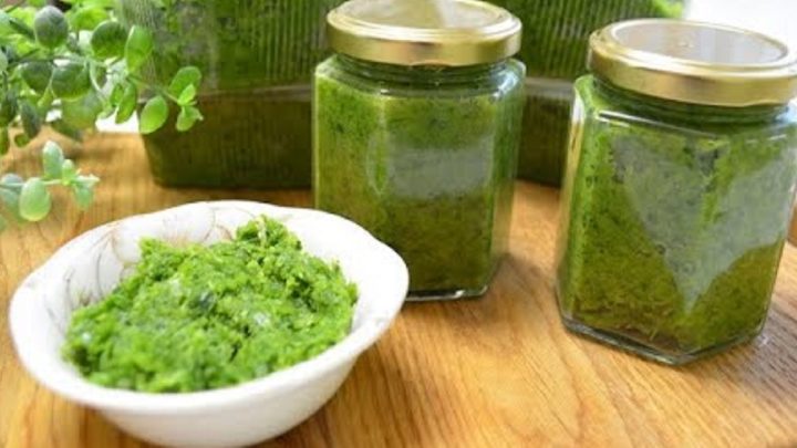 Pesto z křenových listů vložte do sterilizovaných sklenic, které skladujte v lednici.