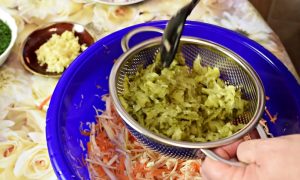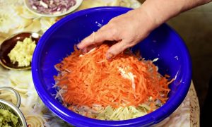 Zelí nakrájejte na tenké nudličky a posypejte je solí Adyghe, podravkou či běžnou kuchyňskou solí a důkladně ho rukou promačkejte, aby změklo. Mrkev očistěte, nastrouhejte ji nahrubo a přidejte ji k zelí. Pokračujte v hnětení, dokud se oba druhy zeleniny nepromísí.