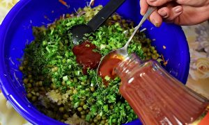 Do směsi prolisujte česnek, přidejte na jemné proužky nakrájenou červenou cibuli, přisypejte hrášek a jemně nasekaný kopr a jarní cibulku. Přidejte lžíci chilli omáčky a několik lžic rajčatové šťávy. Salát důkladně promíchejte, podle potřeby přidejte ještě rajčatovou šťávu a zeleninu zakapejte slunečnicovým olejem.