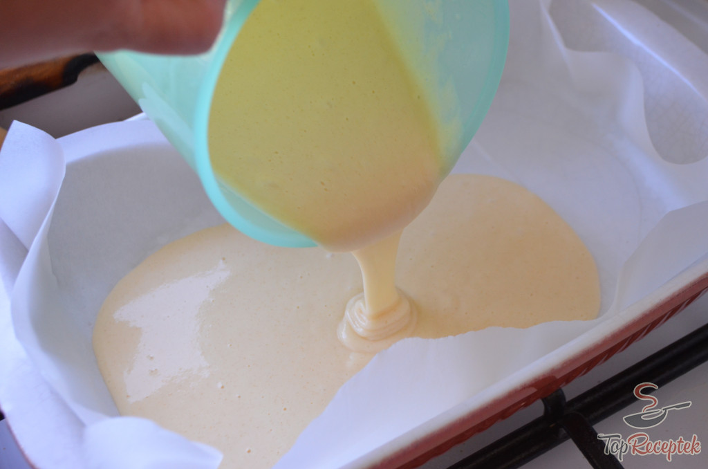 Nejprve si vyšlehejte do pěny vejce s krupicovým cukrem. Poté přilijte mléko, vložte změklé máslo, vsypte polohrubou mouku, kypřící prášek a vypracujte mixérem hladké polotekuté těsto. Nyní si k ruce vezměte plech vystlaný pečícím papírem o rozměrech cca 25 x 35 cm a vlijte do něj polovinu těsta.