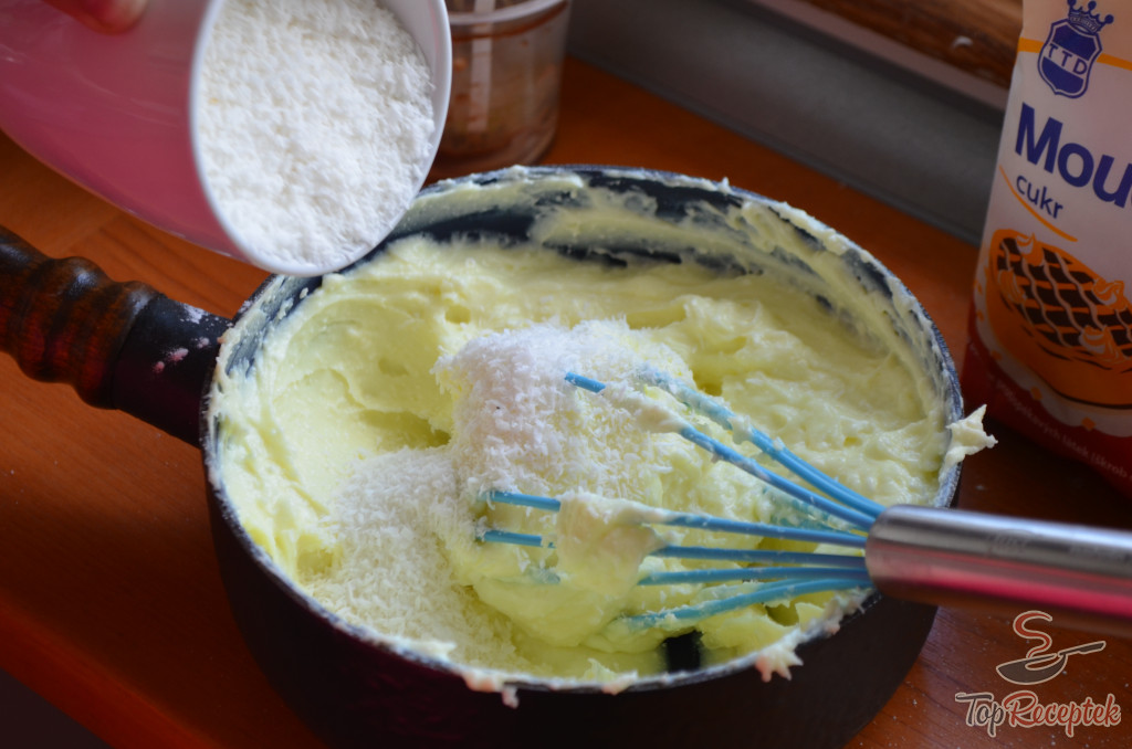 Po zchladnutí ochuťte moučkovým cukrem, vložte sladký tvaroh, kokos a dobře promíchejte.