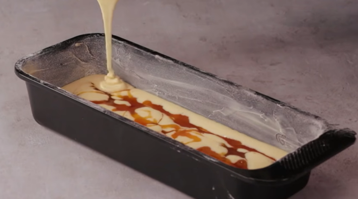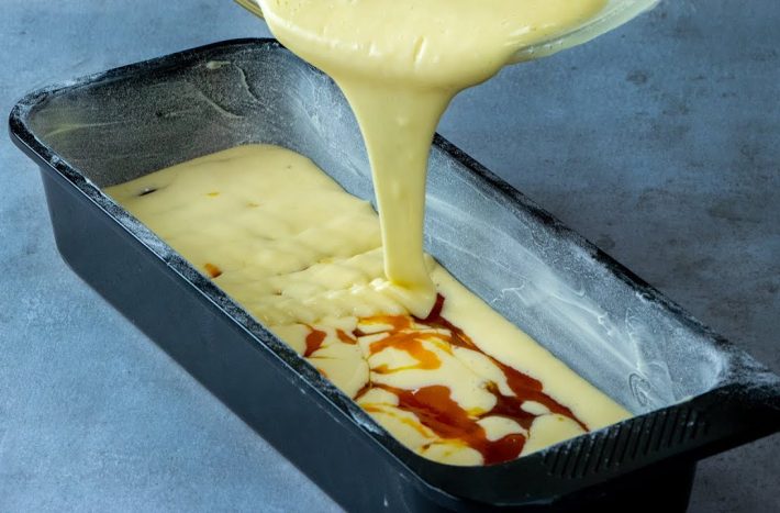 Vezměte meruňkový džem. V případě potřeby a chutí se dá použít jakýkoliv jiný, dle vlastních preferencí. Pomocí lžičky džem pomalu nakapávejte na vrstvu těsta ve formě. Takto do formy přendejte celý a vrstvu zalijte zbytkem připraveného těsta. Opět s formou několikrát lehce zatřeste, aby se těsto dostalo kam má.