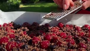 Plech na pečení vyložte pečicím papírem. Poté na něj rovnoměrně rozprostřete mražené třešně a mražené borůvky. Nakonec na ovoce rovnoměrně nastrouhejte hořkou čokoládu.