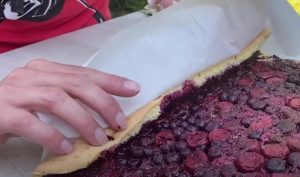 Těsto poté rovnoměrně rozložte na plech na ovoce s čokoládou. Rozehřejte troubu na 180 °C a pečte asi 30 minut. Poté ho nechte vychladnout. Následně dejte přes plech pečicí papír a překlopte korpus tak, aby těsto bylo dole a ovoce nahoře. Poté vše srolujte do rolády, tu zabalte do pečicího papíru a dejte do ledničky ztuhnout.