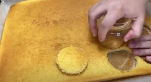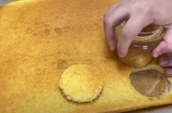 Po vychladnutí z korpusu vykrajovátkem nebo skleničkou vykrájejte co největší počet koleček. Zbytek korpusu nevyhazujete, ale rozdrobte ho na jemno. Kolečka pak potřete 100 mililitry pomerančové šťávy.