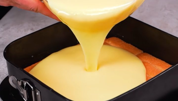 Nachystejte si obdélníkovou formu na dort a do mísy nalijte mléko. Cukrářské piškoty vždy nejprve namočte v mléce a následně je umístěte do formy na dort. Mléko na pudinkovou směs nalijte do hrnce, rozehřejte jej a přidejte cukr krystal a balení pudinku. Důkladně promíchejte, nechejte provařit a přidejte i máslo. Vařte, dokud celá směs nezhoustne a poté ji nalijte na piškoty. Nechejte odležet v lednici na půl hodiny.