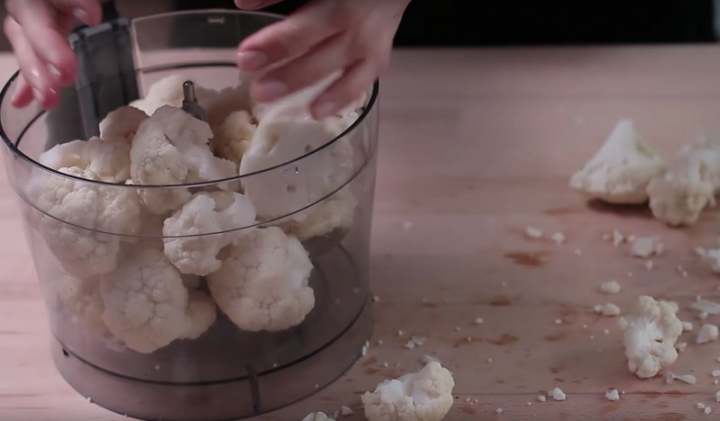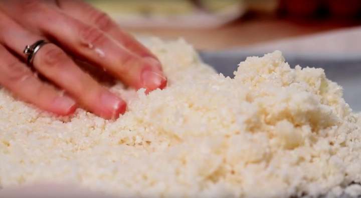 Nasekaný květák rozprostřete na plech a vložte ho do trouby vyhřáté na 190 stupňů Celsia asi na 15 minut. Po vyjmutí květák vložte do bavlněné utěrky a důkladně z něj vymačkejte veškerou vodu, která by jinak narušila konzistenci a soudržnost budoucího těsta.
