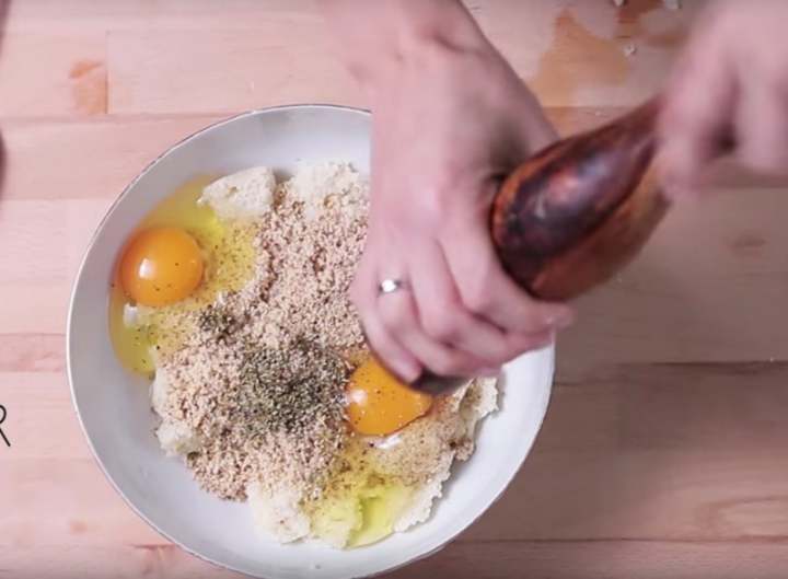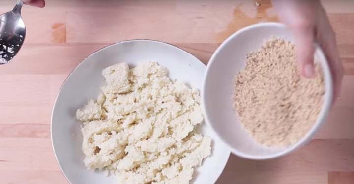 Vymačkaný květák vložte do mísy a přidejte k němu mleté mandle (nebo koupenou mandlovou mouku).