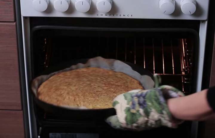 Na ten pak rozprostřete květákové těsto a urovnejte jeho povrch do roviny. Zvyšte teplotu v troubě na 240 °C a pečte květákový korpus 15 minut. Když těsto zezlátne a je mírně křupavé, můžete ho vytáhnout.