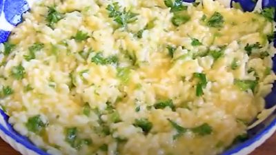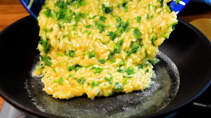 V samostatné misce vyšlehejte vejce se solí a pepřem a smíchejte je s nasekanou petrželkou. Směs vmíchejte do uvařené rýže a vzniklou hmotu rovnoměrně rozprostřete do pánve s rozpáleným olejem.