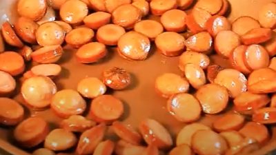 Párky nakrájejte na tenká kolečka, která smažte na rozpáleném olivovém oleji 3–5 minut. Poté uzeninu přendejte do misky.