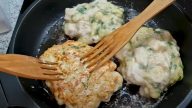 Směs smíchejte s majonézou, moukou a vytvořte z ní placičky o velikosti dlaně. Placičky z kuřecích prsou smažte v pánvi s rozpáleným olejem po dobu 5 minut z každé strany.