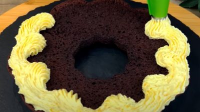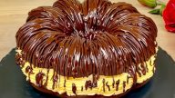 Krém zakryjte vrchní částí bábovky, kterou na závěr ozdobte čokoládovou polevou.