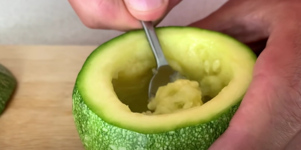 Následně si vezměte k ruce lžíci a pomocí ní vydlabejte dužinu cukety. Tu dejte stranou, použijete ji později.