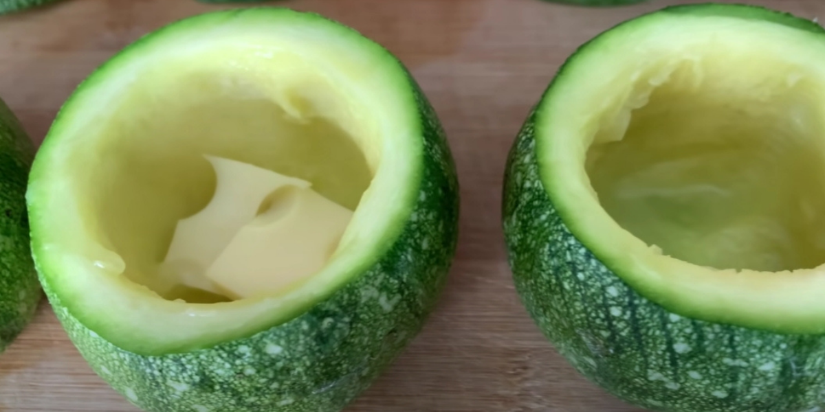 Nyní si ementál nakrájejte na plátky a položte jej na dno každé vydlabané cukety.