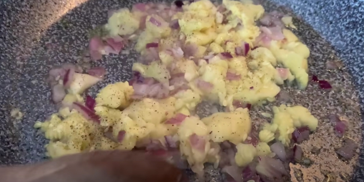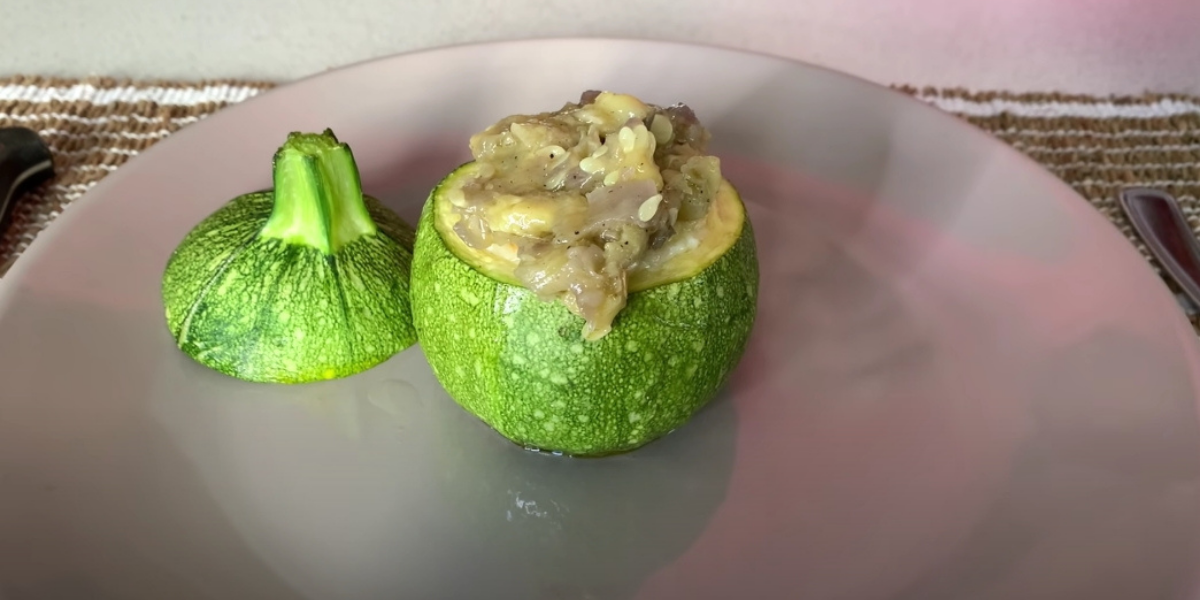 Dále si připravte ještě dodatečnou náplň k podávání z vydlabané cuketové dužiny. Na rozpáleném olivovém oleji orestujte jemně pokrájenou červenou cibuli. Pak přidejte i nadrcený česnekový stroužek, dužinu z cukety, osolte, opepřete dle preferencí a pečlivě promíchejte.