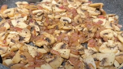 Na výpeku smažte nadrobno nakrájenou cibuli 2–3 minuty a následně k ní přidejte plátky hub. Směs osolte, opepřete a po dalších 2 minutách smažení ji odstavte z tepla.