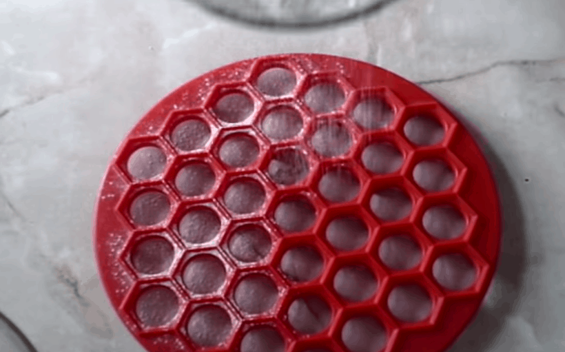Tajným nástrojem pak je speciální plastová forma na plněné knedlíčky, kterou lze na internetu získat za cenu kolem dvou set korun. Vypadá tak trochu jako hrací plocha pro starou hru Kloboučku, hop. Nachází se v ní množství kulatých otvorů s šestiúhelníkovými hranami.