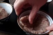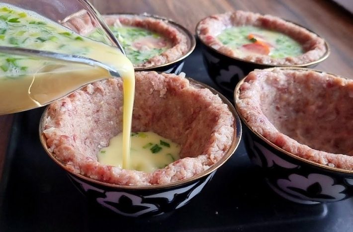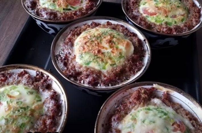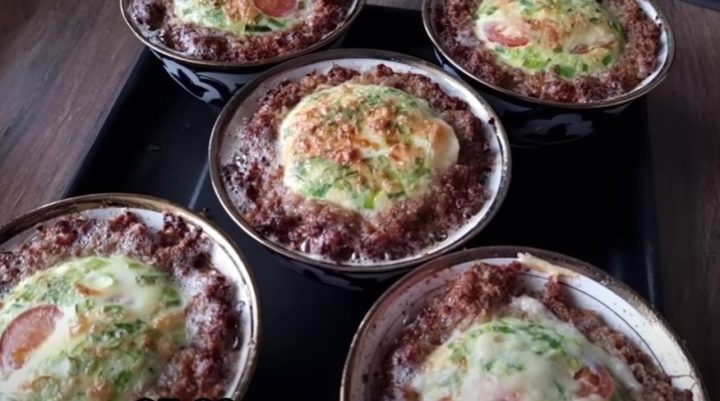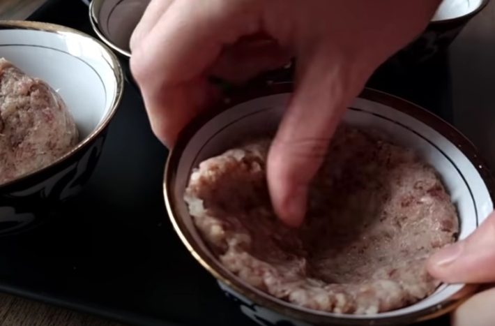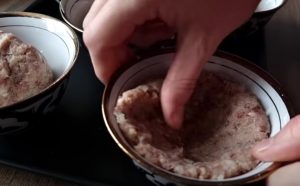 Nakrájejte cibuli na malé kostičky a smíchejte jí s mletým masem. Přidejte strouhanku a vejce. Dle chuti vše osolte, opepřete a použijte vaše oblíbené koření na mleté maso. Přidejte trochu oleje, 70 mililitrů vody a vypracujte homogenní směs. Rozdělte ji na 5 částí. Připravte si 5 porcelánových mističek, vymažte je máslem a podél stěn z mletého masa vytvarujte misku.