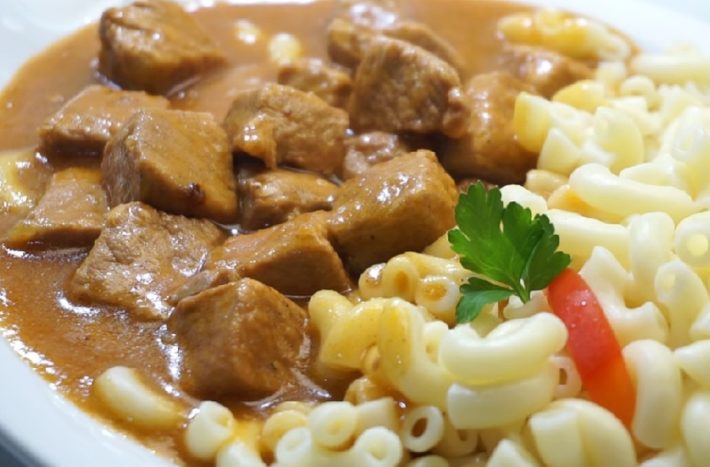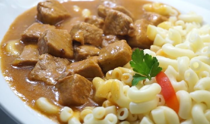 Podlijte směs horkou vodou, dobře promíchejte a nechte ji pod poklicí asi hodinu dusit, dokud nebude maso měkké. V případě potřeby zamíchejte a dolijte vodou. Během dušení si podle návodu uvařte těstoviny. Po změknutí masa omáčku zahustěte polohrubou moukou s trochou vody a nechte 10 minut provařit. Dle chuti dosolte. Hotové maso s omáčkou podávejte s těstovinami.