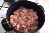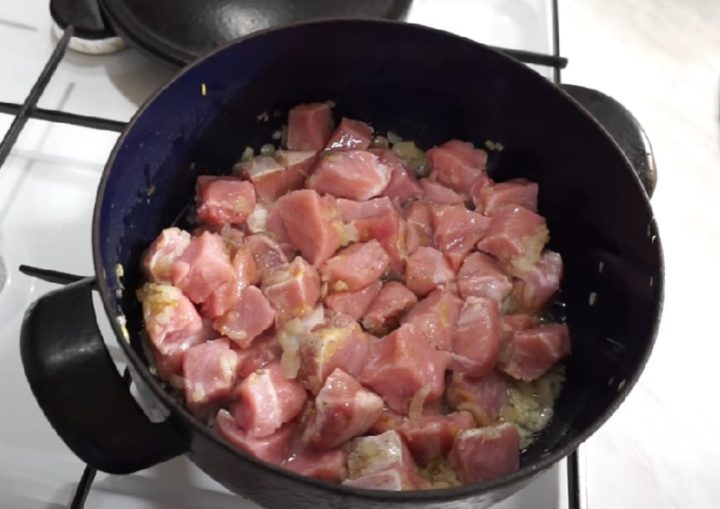 Vepřové maso, lze použít například pečeni, nakrájejte na kostky a cibuli na kostičky. Dejte do hrnce trochu oleje a na něm nechte smažit cibuli, dokud nezesklovatí. Mezitím si osolte a opepřete maso a pak ho dejte k cibuli a orestujte. Pak přidejte červenou papriku, ostrý kečup a prolisovaný česnek.