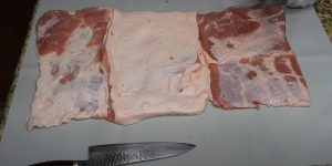 Bůček omyjte, usušte papírovými utěrkami a rozřízněte do velkého obdélníkového tvaru o tloušťce cca 2 cm viz obrázek. Naklepejte jej, abyste vyhladili jeho povrch. Posypejte ho směsí koření a nebojte se jej rukama do masa pořádně vmasírovat. Postup opakujte i z druhé strany.