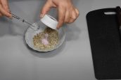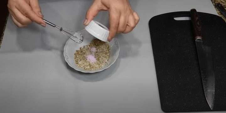 Do hmoždíře umístěte špetku soli a kuličky černého pepře s koriandrem. Rozdrťte je a vsypejte do větší mističky. Přidejte k nim zbytek soli, mletý bobkový list, granulovaný česnek a provensálské bylinky. Promíchejte a na závěr dodejte dusitanovou sůl.
